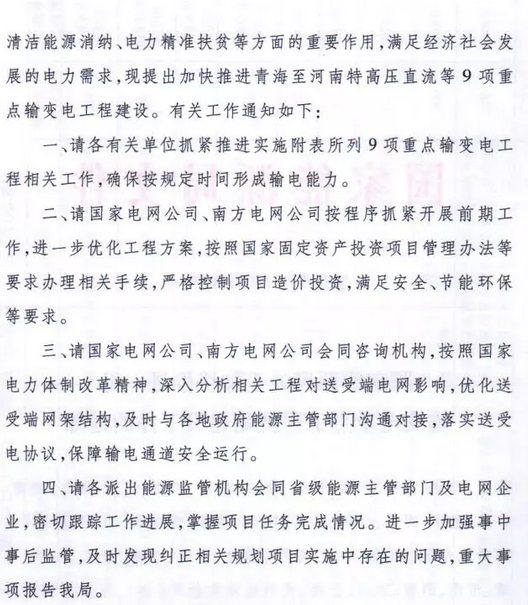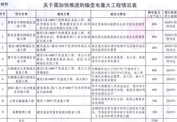 9月7日獲悉,國(guó)家能源局印發(fā)《關(guān)于加快推進(jìn)一批輸變電重點(diǎn)工程規(guī)劃建設(shè)工作的通知》國(guó)能發(fā)電力〔2018〕70號(hào),《通知》指出,為加大基礎(chǔ)設(shè)施領(lǐng)域補(bǔ)短板力度,發(fā)揮重點(diǎn)電網(wǎng)工程在優(yōu)化投資結(jié)構(gòu)、清潔能源消納、電力精準(zhǔn)扶貧等方面的重要作用,加快推進(jìn)青海至河南特高壓直流、白鶴灘至江蘇、白鶴灘至浙江特高壓直流等9項(xiàng)重點(diǎn)輸變電工程建設(shè),合計(jì)輸電能力5700萬(wàn)千瓦(工程見附件)。