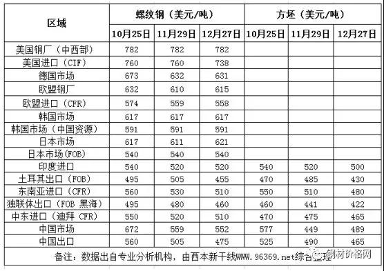 方坯價(jià)格方面:12月份與11月同期相比,土耳其出口報(bào)盤(pán)(FOB價(jià))下跌55美元/噸,獨(dú)聯(lián)體出口黑海報(bào)盤(pán)(FOB價(jià))下跌19美元/噸;中東市場(chǎng)進(jìn)口價(jià)下跌10美元/噸,東南亞進(jìn)口(CFR)價(jià)格下跌30美元/噸。