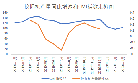 對比挖掘機產(chǎn)量各月同比增速和CMI走勢來看,挖掘機產(chǎn)量同比增速和CMI指數(shù)走勢基本保持一致。2020年3月CMI指數(shù)環(huán)比有所回升,預(yù)計2020年3月挖掘機產(chǎn)量同比增速也將有所提高。